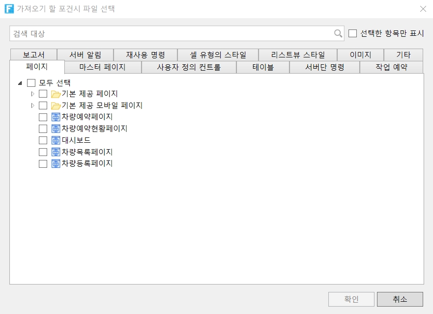 포건시 파일 가져오기 대화상자에서 페이지, 마스터페이지, 테이블, 서버 명령, 예약된 작업 등을 가져올 수 있습니다. 선택을 하고 확인을 클릭합니다.