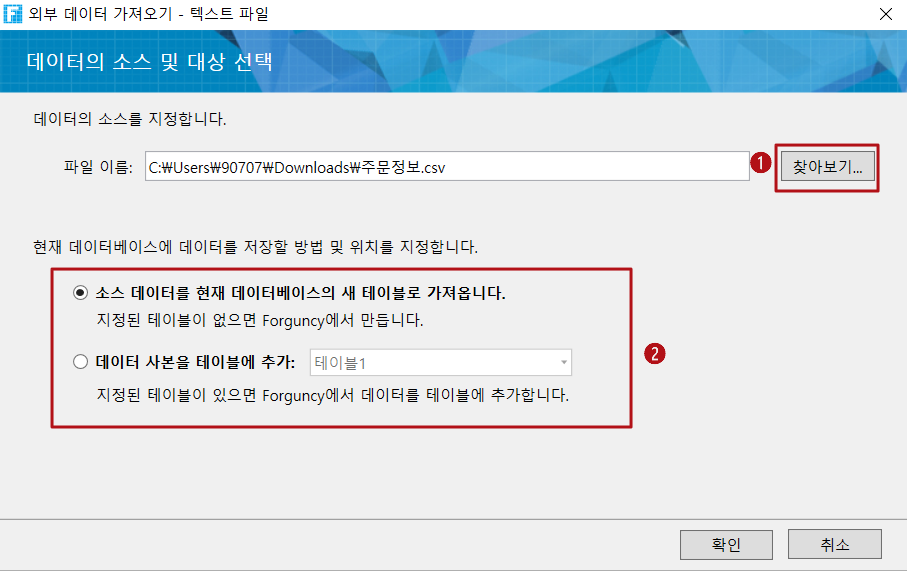 [찾아보기]를 클릭하고 가져올 텍스트 파일을 선택한 다음 [확인]을 클릭합니다. 데이터가 현재 데이터베이스에 저장되는 방법과 위치를 지정할 수 있습니다.
