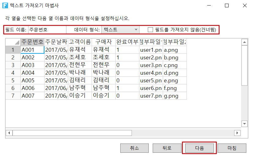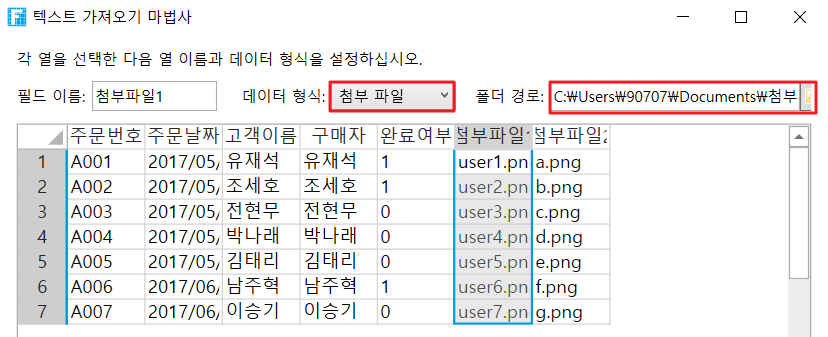 가져온 필드의 데이터 형식을 설정합니다. 필드를 선택하여 이름 및 데이터 형식을 수정합니다. 필드를 가져오지 않으려면 필드를 선택한 후 "필드 가져오기 않음(건너뜀)"을 선택할 수도 있습니다. 선택한 필드의 데이터 형식을 그림 및 첨부 파일로 설정한 경우 폴더의 주소를 설정해야 합니다. 이미지 또는 첨부 파일 필드의 데이터가 절대 경로인 경우 폴더 주소를 설정하지 않을 수도 있습니다. 폴더 주소가 그림 또는 첨부 파일의 데이터와 결합되어 전체 주소로 결합되는 경 지정된 파일에 액세스할 수 있습니다.
