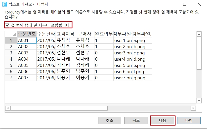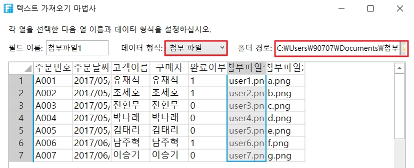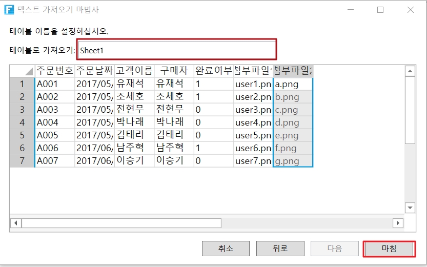 [마침]을 클릭하면 텍스트 파일의 데이터를 포건시의 데이터 테이블로 가져옵니다. 임의로 생성된 GUID는 가져온 그림 및 첨부 파일의 파일 이름 앞에 자동으로 추가됩니다.