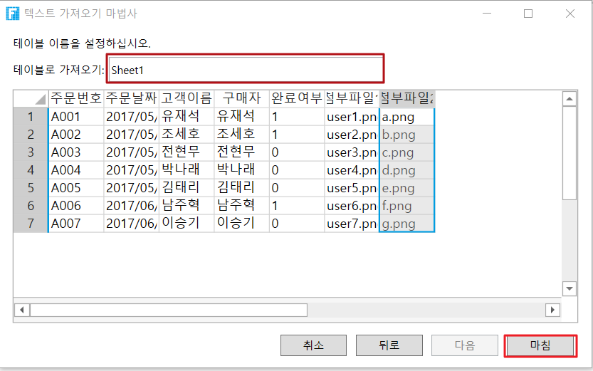 테이블 이름을 설정하고 [마침]버튼을 클릭합니다. 2단계에서 "데이터 사본을 레코드에 추가"를 선택하면 테이블 이름이 결정되고 수정할 수 없으며 가져온 레코드가 테이블에 이미 있는 레코드 뒤에 추가됩니다.