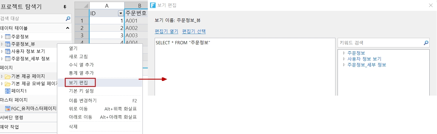 뷰를 선택하고 마우스 오른쪽 버튼을 클릭하여 [보기 편집]을 클릭하 대화 상자에서 SQL 문을 수정합니다.