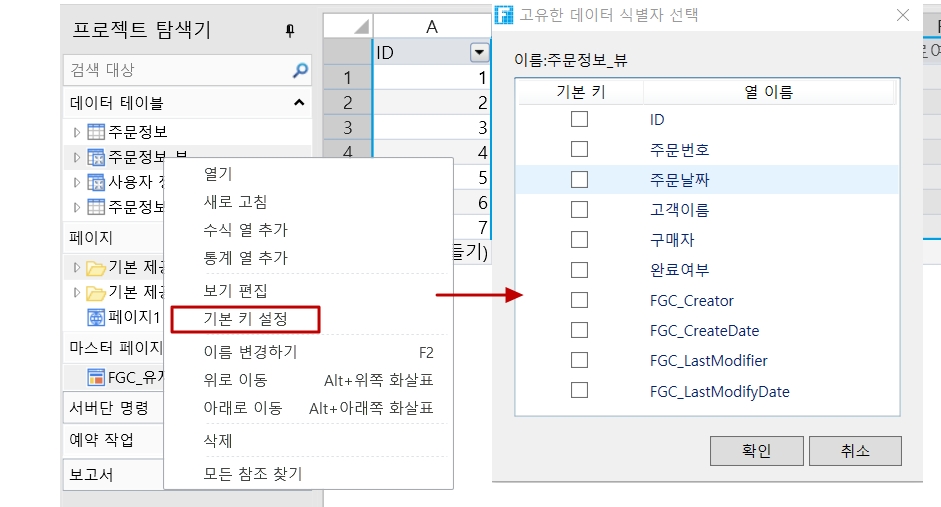 뷰를 선택하고 마우스 오른쪽 버튼을 클릭하여 [기본 키 설정]을 선택합니다.