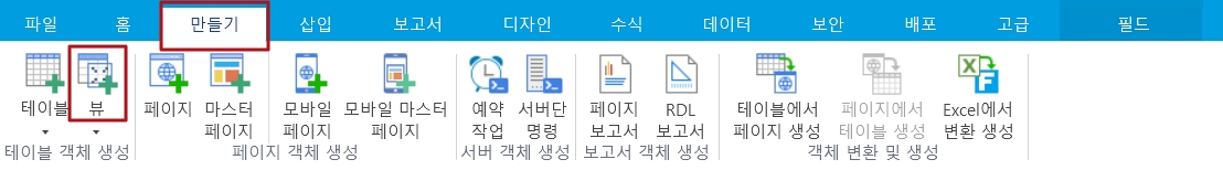 리본 메뉴 모음에서 [만들기]>[뷰]를 선택합니다.