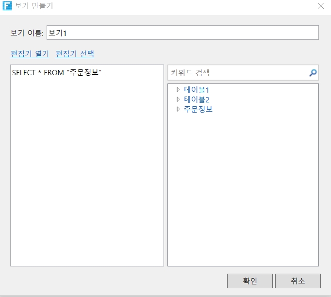 [보기 만들기] 대화 상자에서 뷰 이름과 SQL 문을 입력합니다.
