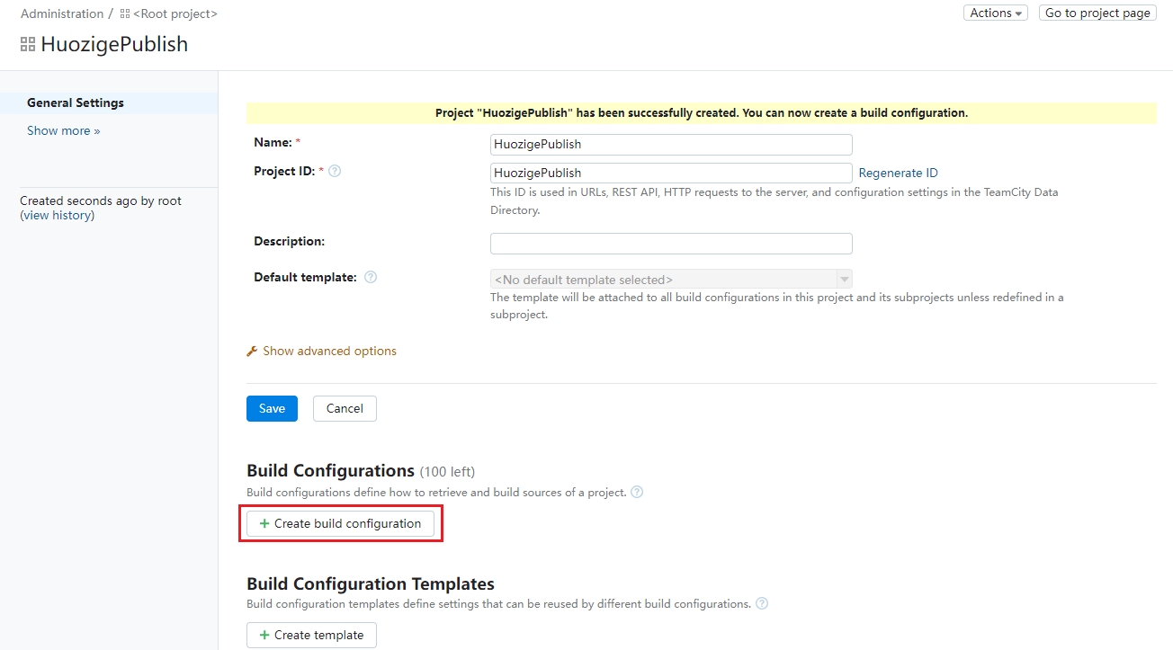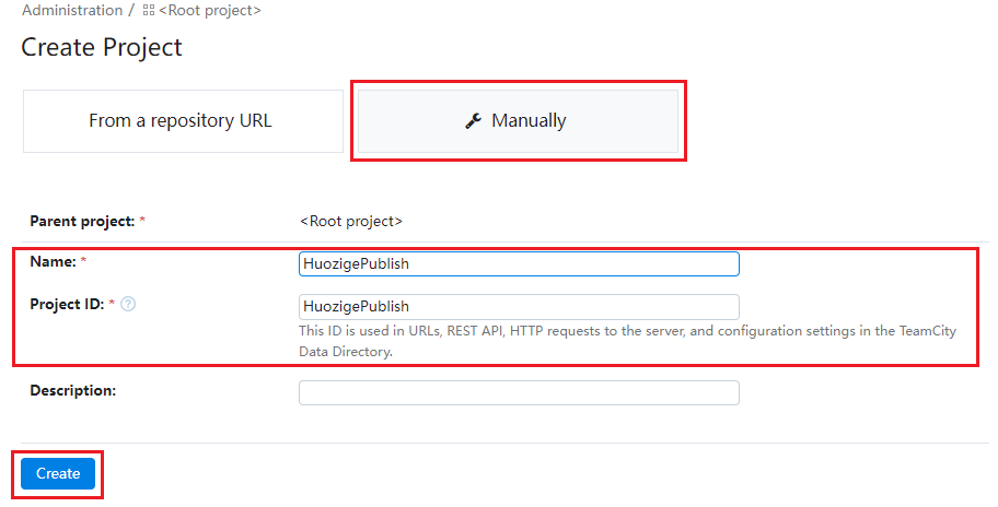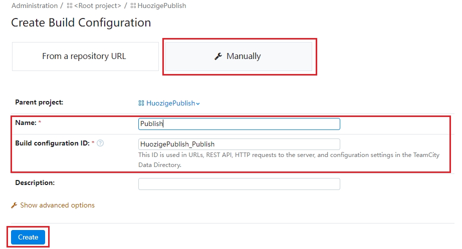 "수동"을 선택하고 프로젝트 정보 "이름"과 "빌드 구성 ID"를 입력한 후 "만들기"를 클릭합니다.