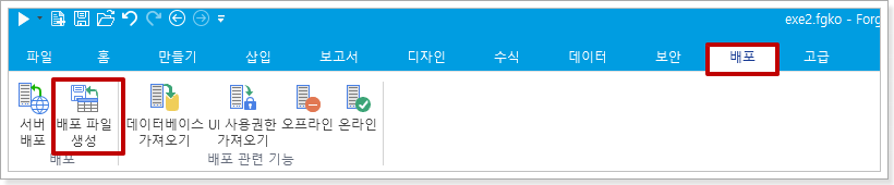 빌더의 리본 메뉴 모음에서 배포-> 배포파일생성을 선택하여 파일을 로컬로 저장합니다.