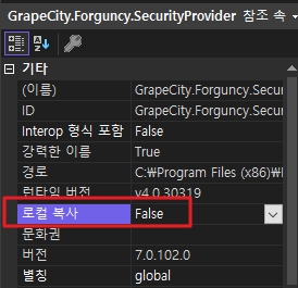 " GrapeCity.Forguncy.SecurityProvider.dll " 파일을 선택하고 마우스 오른쪽 버튼을 클릭하고 "속성"을 선택한 다음 "로컬복사"를 "False"로 변경합니다.