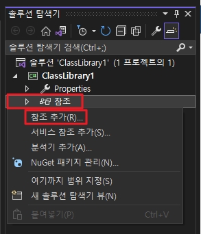 솔루션 탐색기에서 참조를 마우스 오른쪽 버튼으로 클릭하고 참조 추가를 선택합니다.