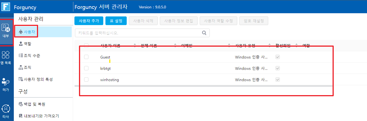 2. 사용자 목록에 윈도우 도메인의 계정이 들어 있는 것을 확인할 수 있습니다.