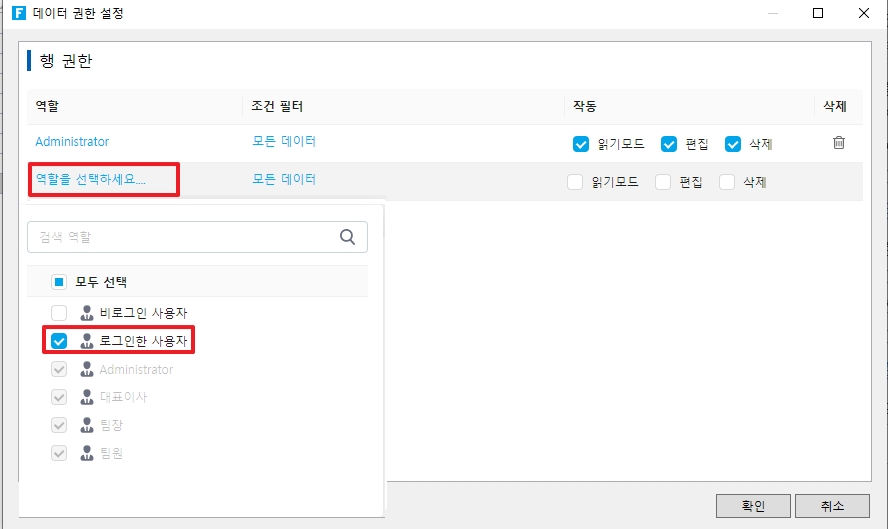 권한이 부여된 사용자를 설정합니다. 팝업 역할 목록에서 행 권한을 부여하는 역할을 선택하려면 역할 열을 클릭하십시오. 예를 들어 "로그인 사용자"를 선택합니다.