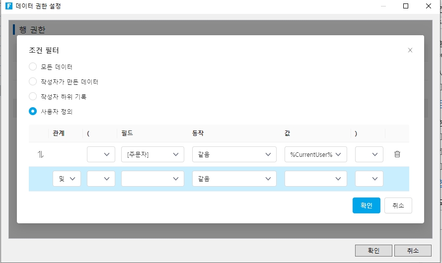 데이터 테이블을 열고 오른쪽 열 테이블 설정에서 행 권한 설정을 선택하고, 권한편집을 클릭합니다.