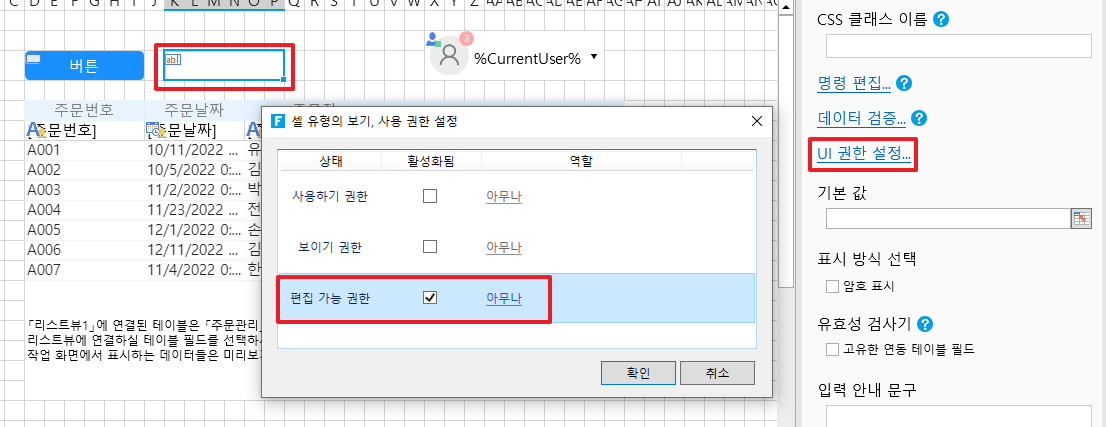 예를 들어 텍스트 상자의 편집 가능 권한을 로그인한 사용자가 편집할 수 있도록 설정합니다.