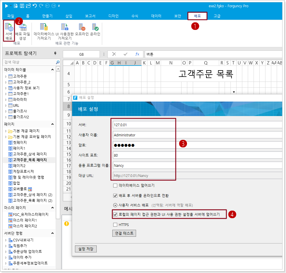 셀 권한을 설정한 후 리본 메뉴 모음에서 [배포->서버배포]를 선택하고 배포 설정 대화 상자에서 다음 [로컬의 페이지 접근 권한과 UI 사용 권한 설정을 서버에 덮어쓰기]를 선택합니다.