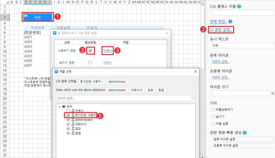 셀 유형이 설정된 셀을 선택하고, 셀 설정에서 "셀 권한"을 클릭하면 셀 권한 설정 대화상자가 나타납니다.