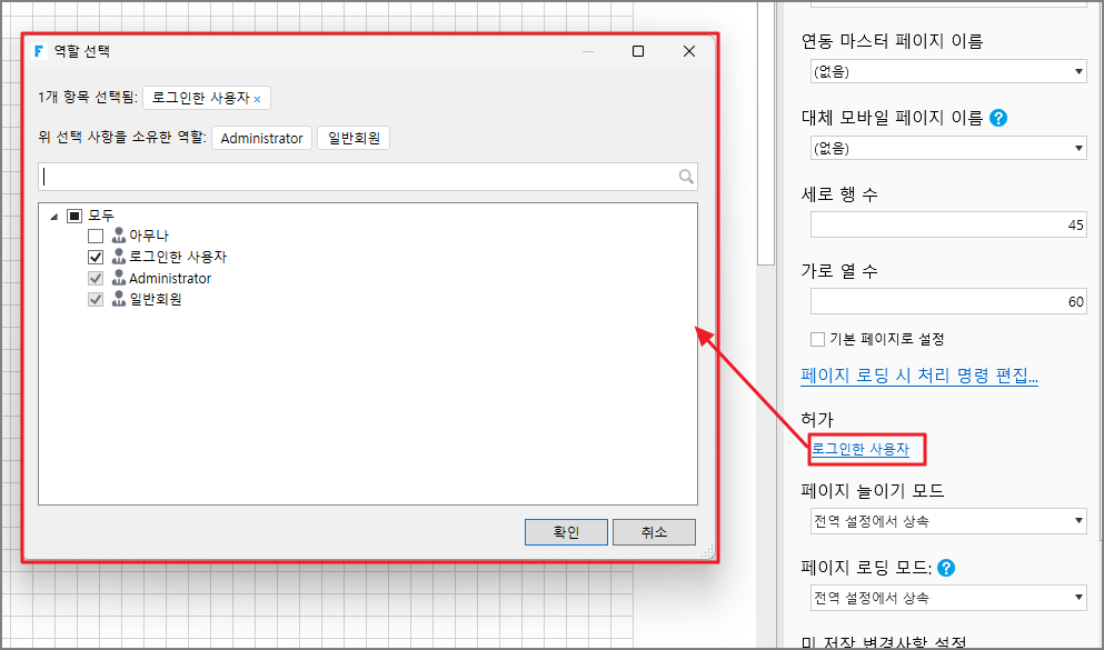 페이지를 선택하고 오른쪽 페이지 설정에서 "권한 설정" 아래의 "로그인 사용자" 하이퍼링크를 클릭합니다.