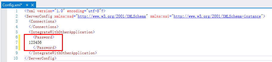 서버의 "C:\Users\Public\Documents\ForguncyServer\ *Application Name* " 디렉토리에서 "Config.xml" 구성 파일을 찾아 열고 아래 그림과 같이 Password 값을 편집합니다.