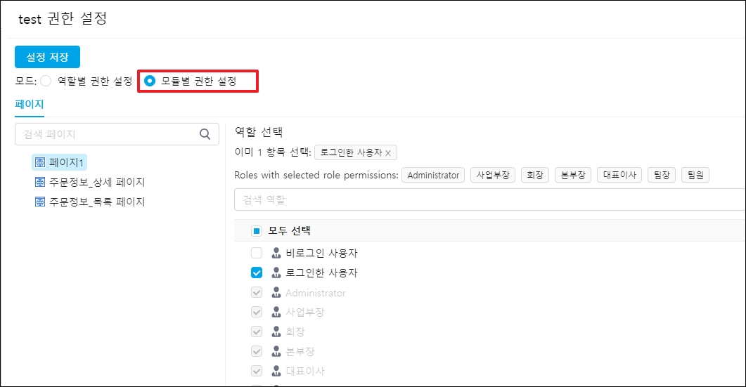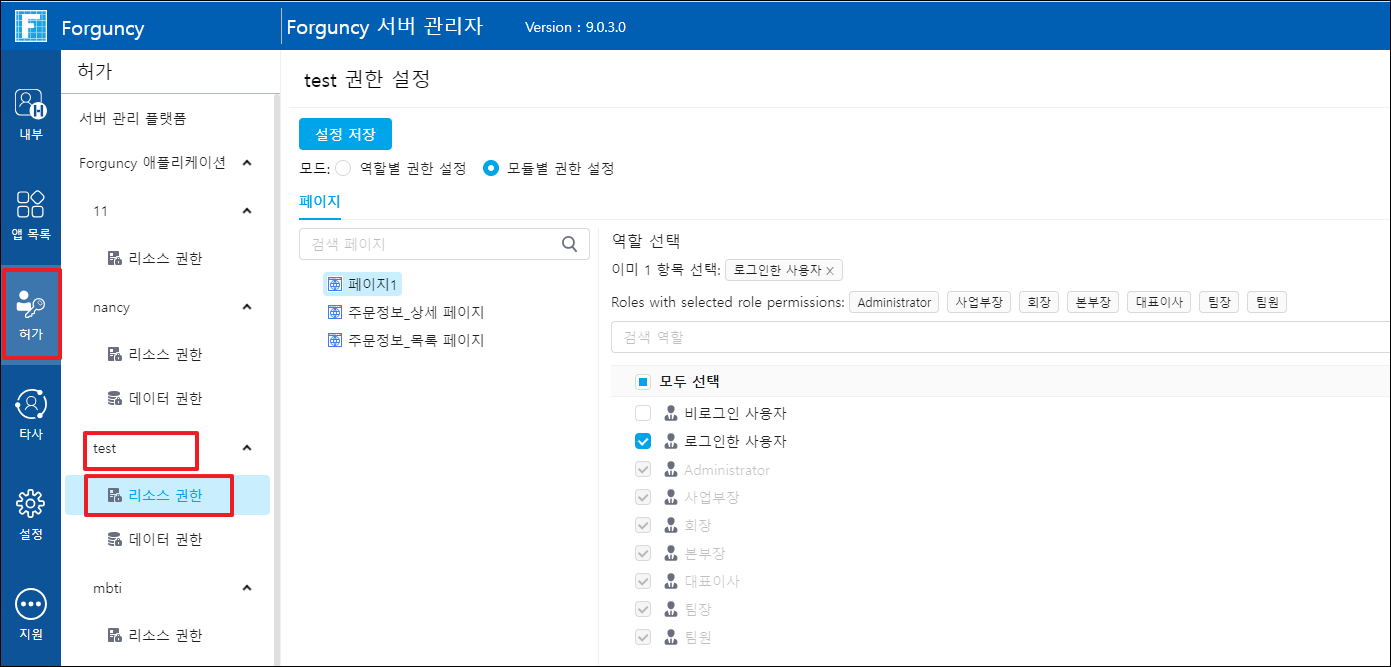 리소스 권한을 설정한 후 설정 저장을 클릭하면 권한이 적용됩니다.