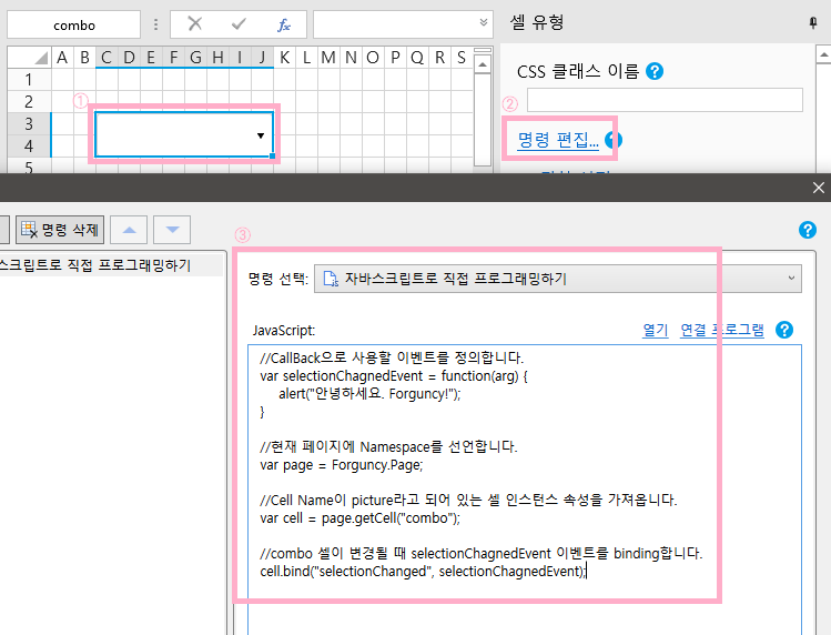 cell.bind("selectionChanged", selectionChangedEvent);Forguncy 사용 예제