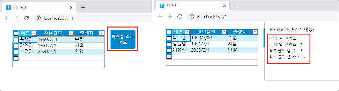 페이지를 실행하고 페이지에서 테이블 위치 정보 버튼을 클릭하면 시작 행 인덱스, 시작 열 인덱스, 테이블 행 수 및 열 수를 포함하여 디자이너에서 테이블 위치 정보가 표시되는 경고 상자가 나타납니다.