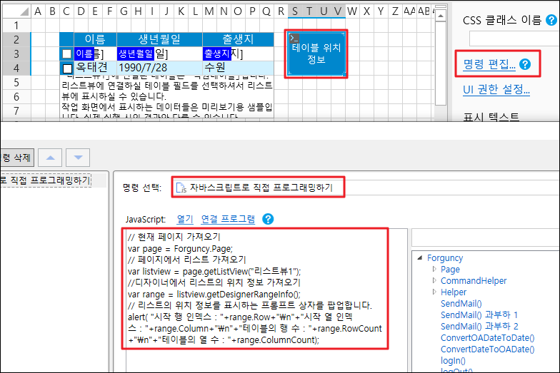 ![](https://help.grapecity.com.cn/download/thumbnails/72365498/%E6%AD%A5%E9%AA%A42.png?version=1\&modificationDate=1648092730000\&api=v2)셀 범위를 선택하고 셀 유형을 버튼으로 설정하고 명령을 \[자바스크립트로 직접 프로그래밍하기]으로 편집하고 JavaScript 코드를 입력합니다.