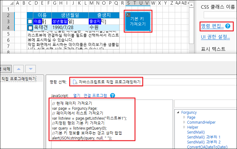 ![](https://help.grapecity.com.cn/download/thumbnails/72365552/%E6%AD%A5%E9%AA%A42.png?version=1\&modificationDate=1648092731000\&api=v2)셀 범위를 선택하고 셀 유형을 버튼으로 설정하고 명령을 \[자바스크립트로 직접 프로그래밍하기]으로 편집하고 JavaScript 코드를 입력합니다.