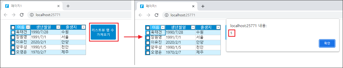 페이지를 실행하고 페이지에서 테이블 행 수 가져오기 버튼을 클릭하면 테이블의 행 수를 보여 주는 경고 상자가 나타납니다.