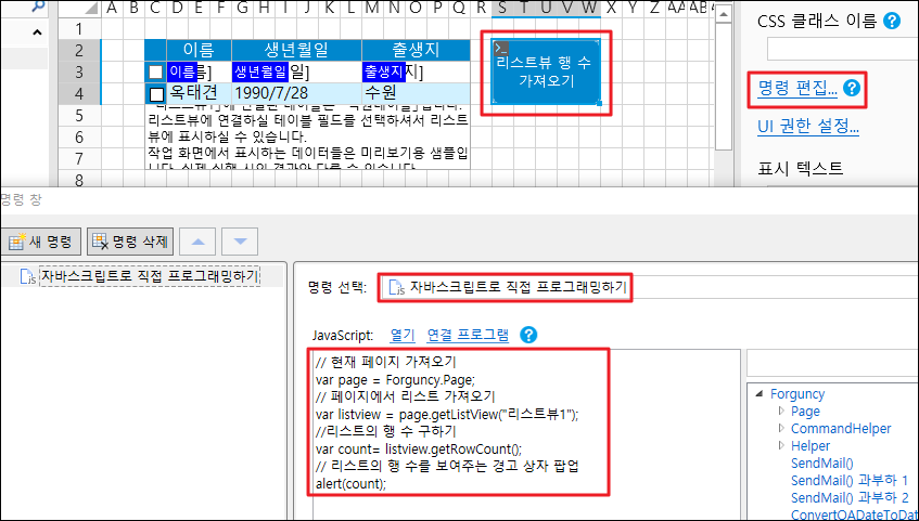 ![](https://help.grapecity.com.cn/download/thumbnails/72365564/%E6%AD%A5%E9%AA%A42.png?version=1\&modificationDate=1648092731000\&api=v2)셀 범위를 선택하고 셀 유형을 버튼으로 설정하고 명령을 \[자바스크립트로 직접 프로그래밍하기]으로 편집하고 JavaScript 코드를 입력합니다.