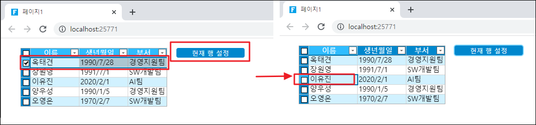 페이지를 실행하고, 기본 현재 동작의 첫 번째 행을 설정하고, 페이지에서 현재 행 설정 버튼을 클릭하면 지정된 행이 현재 행으로 설정됩니다.