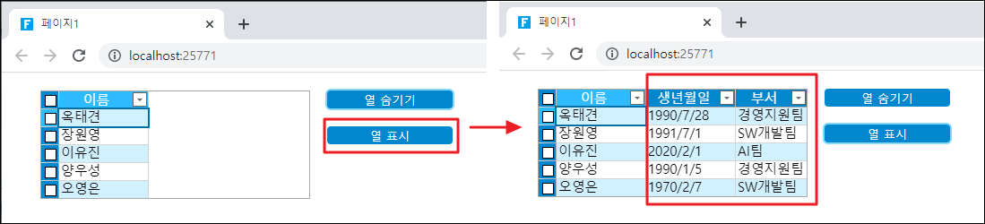 * 페이지를 실행하고 페이지에서 열 숨기기 버튼을 클릭하면 생년월일 및 부서 열이 숨겨집니다.