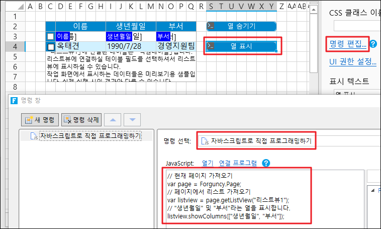 ![](https://help.grapecity.com.cn/download/thumbnails/72365867/%E6%AD%A5%E9%AA%A42.png?version=1\&modificationDate=1648092736000\&api=v2) 셀 범위를 선택하고 셀 유형을 버튼으로 설정하고 명령을 \[자바스크립트로 직접 프로그래밍하기]으로 편집하고 JavaScript 코드를 입력합니다.