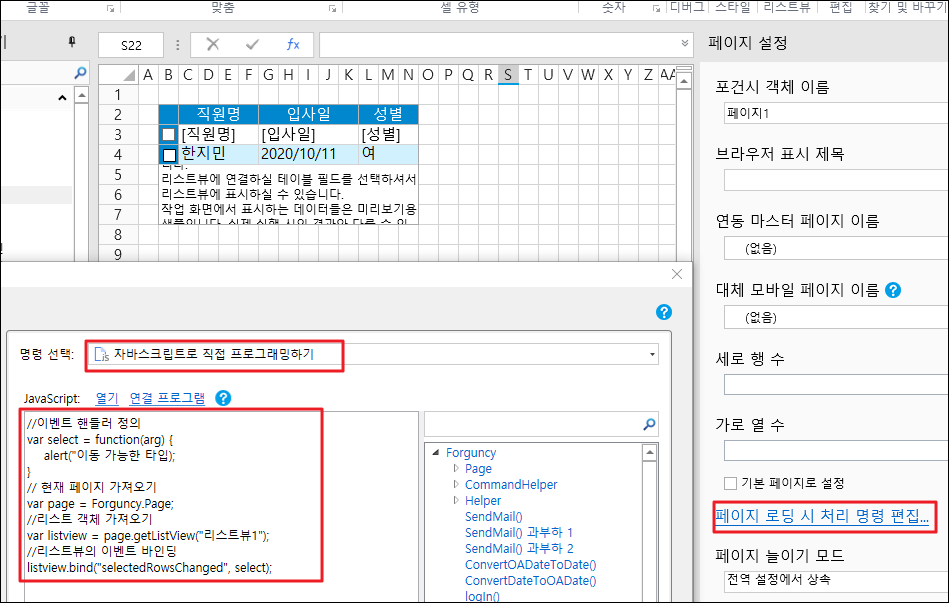 ![](https://help.grapecity.com.cn/download/thumbnails/72365344/%E6%AD%A5%E9%AA%A42.png?version=1\&modificationDate=1648092728000\&api=v2) 페이지 설정을 클릭하고 페이지 로드 시 명령을 편집합니다. 명령은 JavaScript 명령입니다. JavaScript 코드를 입력합니다.