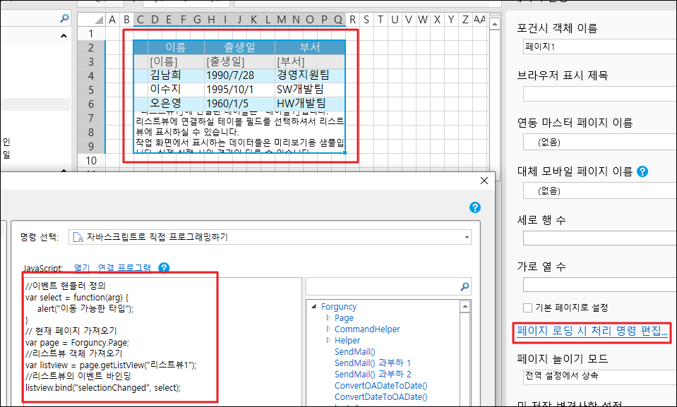 ​​​![](https://help.grapecity.com.cn/download/thumbnails/72365362/%E6%AD%A5%E9%AA%A42.png?version=1\&modificationDate=1648092728000\&api=v2)페이지 설정을 클릭하고 페이지 로드 시 명령을 편집합니다. 명령은 JavaScript 명령입니다. JavaScript 코드를 입력합니다.