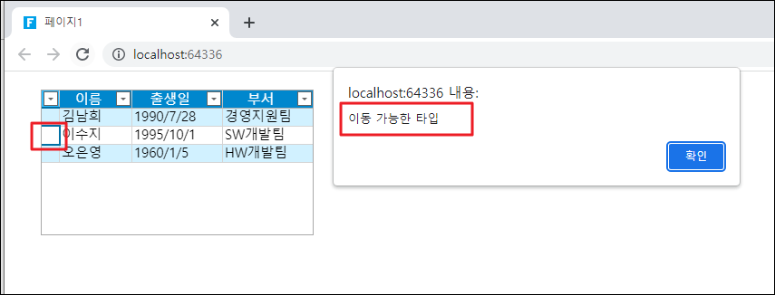 페이지를 실행하면 기본 테이블의 현재 동작의 첫 번째 행이 현재 동작의 두 번째 행을 변경할 때 경고 상자가 나타납니다.