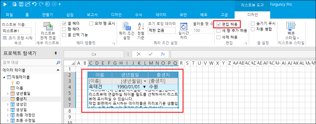 ![](https://help.grapecity.com.cn/download/thumbnails/72365375/%E6%AD%A5%E9%AA%A41.png?version=1\&modificationDate=1648092729000\&api=v2)페이지에서 범위를 선택하고, 데이터 테이블을 셀 범위로 드래그하고, 데이터 테이블의 필드를 바인딩하고, 테이블의 편집 허용을 켭니다.