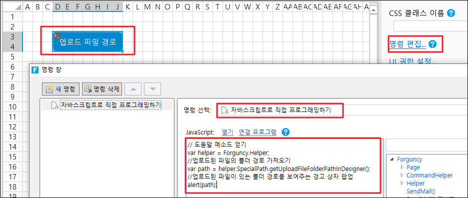 ![](https://help.grapecity.com.cn/download/thumbnails/72366330/%E6%AD%A5%E9%AA%A41.png?version=1\&modificationDate=1648092746000\&api=v2)페이지에서 셀 범위를 선택하고, 셀 유형을 버튼으로 설정하고, 명령을 \[자바스크립트로 직접 프로그래밍하기]으로 편집하고, JavaScript 코드를 입력합니다.&#x20;