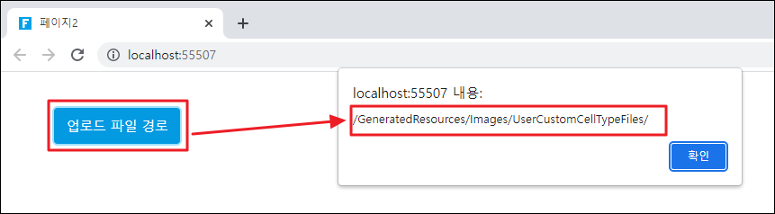 ![](https://help.grapecity.com.cn/download/thumbnails/72366366/%E6%AD%A5%E9%AA%A42.png?version=1\&modificationDate=1648092746000\&api=v2)페이지를 실행합니다.버튼을 클릭하면 업로드된 파일이 있는 폴더의 경로를 보여 주는 경고 상자가 나타납니다.
