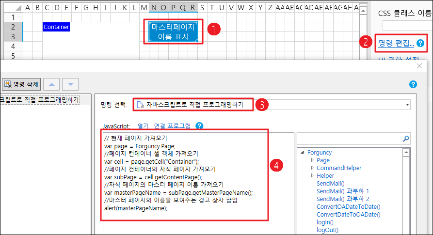 ![](https://help.grapecity.com.cn/download/thumbnails/72366484/%E6%AD%A5%E9%AA%A43.png?version=1\&modificationDate=1648092749000\&api=v2)페이지 1에서 셀 범위를 선택하고 셀 유형을 버튼으로 설정하고 명령을 JavaScript 명령으로 편집하고 JavaScript 코드를 입력합니다.