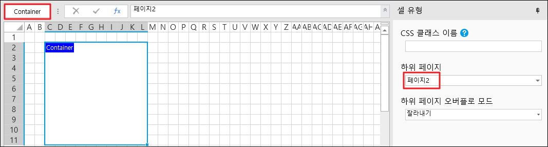 ![](https://help.grapecity.com.cn/download/thumbnails/72366484/%E6%AD%A5%E9%AA%A41.png?version=1\&modificationDate=1648092749000\&api=v2)페이지 1에서 셀 범위를 선택하고 셀 유형을 페이지 내 컨텐츠가 포함된 셀로 설정하고 이름을 "Container"로 지정하고 하위 페이지를 페이지 2로 설정합니다.