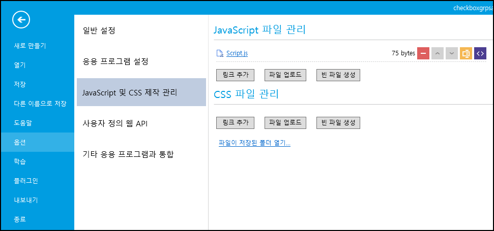 ![](https://help.grapecity.com.cn/download/thumbnails/56532102/%E6%AD%A5%E9%AA%A42.png?version=1\&modificationDate=1611021618000\&api=v2) \[파일-> 옵션-> JavaScript/CSS]를 선택하고 \[JavaScript 파일 관리] 영역에서 \[파일 업로드]를 선택하여 JavaScript 파일을 업로드합니다.