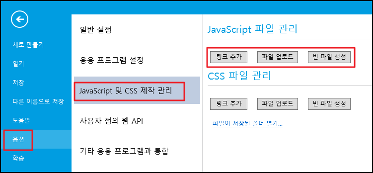 \[파일-> 옵션-> JavaScript/CSS 제작 관]를 선택하고 \[JavaScript 파일 관리] 영역에서 \[링크 추가], \[파일 업로드] 또는 \[빈 파일 생성]을 선택합니다.