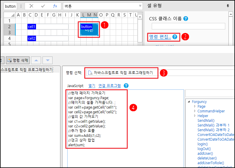 ![](https://help.grapecity.com.cn/download/thumbnails/56532102/%E6%AD%A5%E9%AA%A43.png?version=1\&modificationDate=1611021618000\&api=v2) 셀 범위를 선택하고 셀 유형을 버튼으로 설정하고 이름을 "button"으로 지정합니다. 명령을 편집하고, 명령을 JavaScript 명령으로 설정하고, JavaScript 코드를 입력합니다.