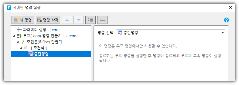 포건시의 서버 측에서는 루프   종료 명령을 사용하여 루프명령 목록의 모든 명령을 종료할 수 있습니다.