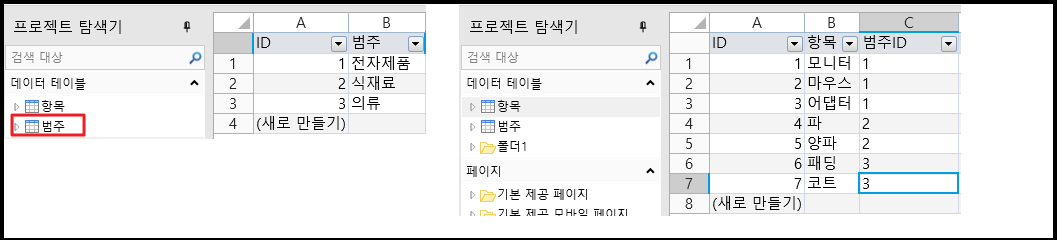 예를 들어 제품 테이블의 범주 ID는 범주 테이블의 ID 필드와 연결됩니다.