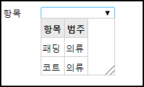실행 후 콤보 상자에 카테고리가 의류와 같은 항목을 쿼리하여 다음과 같이 표시합니다.