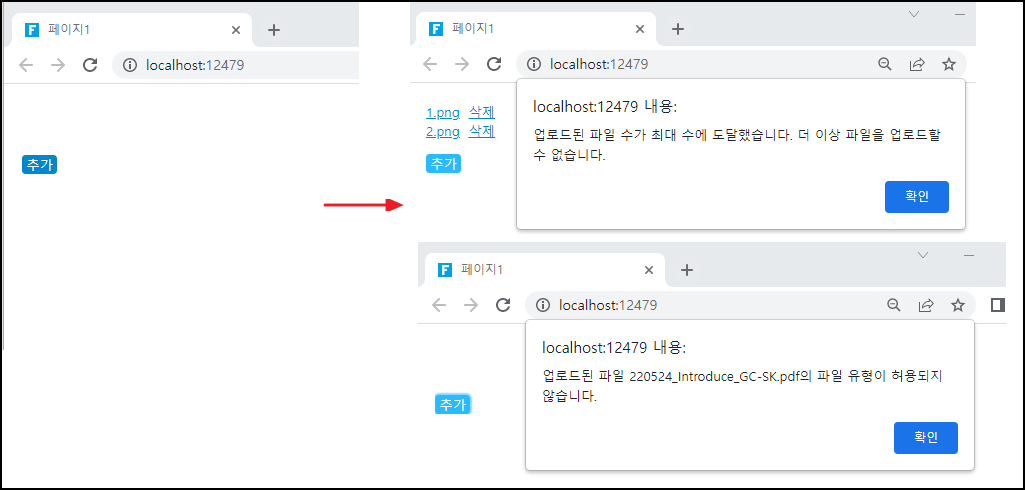 잘못된 파일 형식, 설정된 크기 및 수를 업로드하면 오류 메시지가 나타납니다.