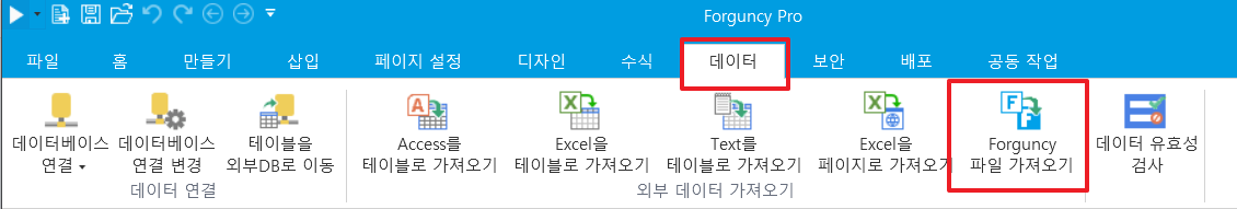 1. 리본메뉴에서 \[데이터>Forgucny파일가져오기]를 선택합니다.