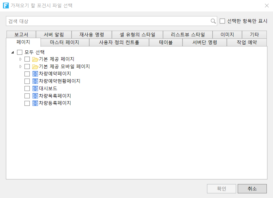 3. 포건시 파일 가져오기 대화상자에서 페이지, 마스터페이지, 테이블, 서버 명령, 예약된 작업 등을 가져올 수 있습니다. 선택을 하고 확인을 클릭합니다.
