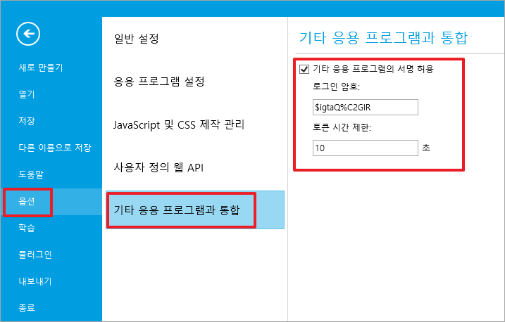 포건시 빌더에서 \[파일>옵션>기타 응용 프로그램과 통합]을 선택하여 암호를 보고 설정합니다.&#x20;