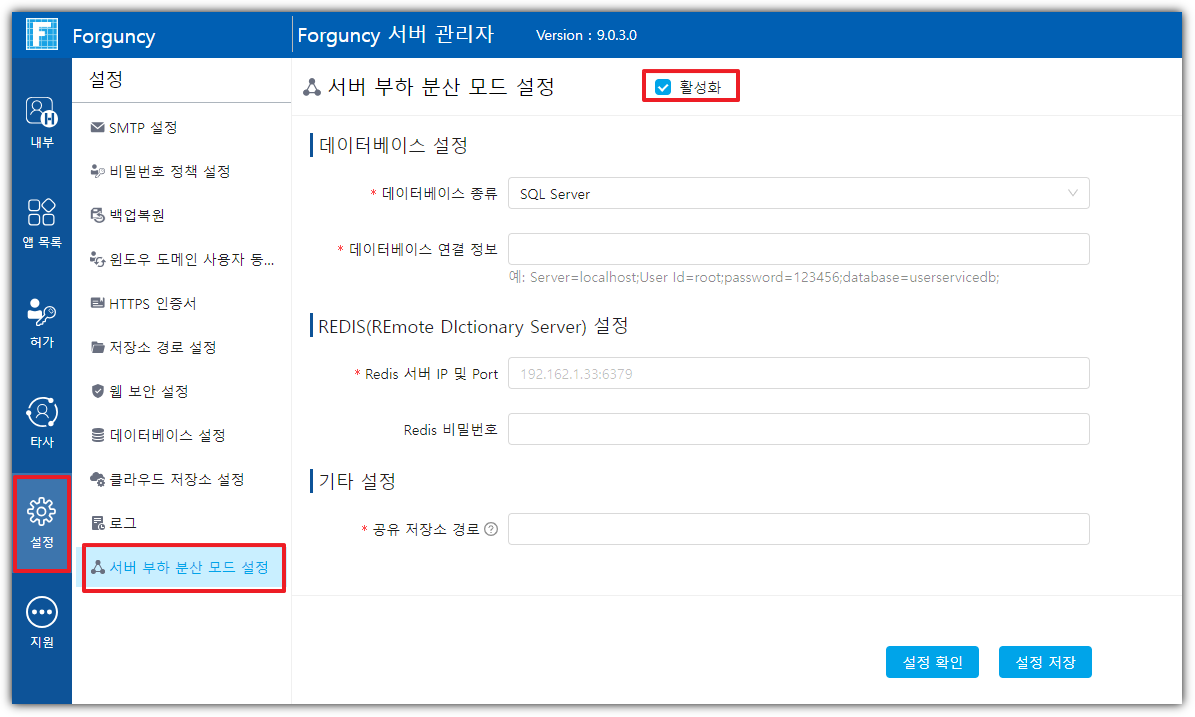 ![](https://help.grapecity.com.cn/download/thumbnails/80954068/%E6%AD%A5%E9%AA%A41.png?version=1\&modificationDate=1673923298000\&api=v2)  서버관리자에 로그인하고 "설정 -> 서버부하 분산 모드 설정" 을선택하여 부하 분산 구성 페이지로 들어갑니다.